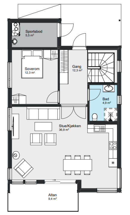 Går du inn hovedinngangen i andre etasje finner du soverom, bad og en åpen stue- og kjøkkenløsning med tilgang til en koselig altan. Går du ned i første etasje finner du resten av fasilitetene du trenger for at Giske skal være en komplett bolig for hele familien.