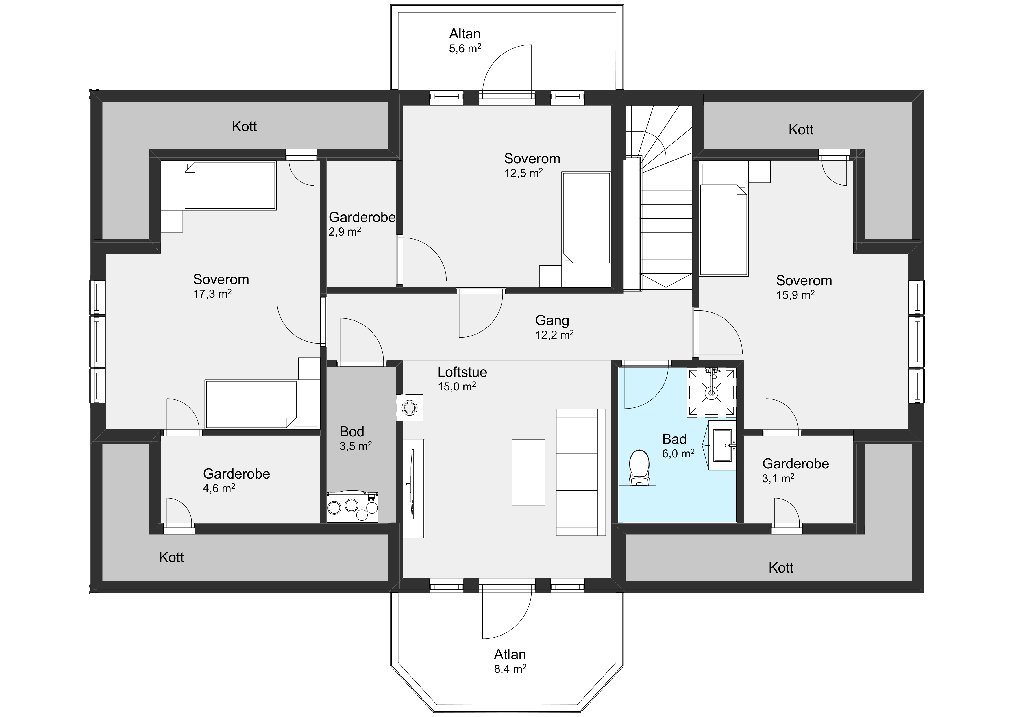 I første etasje får du alle nødvendige funksjoner samlet, inkludert en stor og åpen stue- og kjøkkenløsning. I andre etasje finner du tre store soverom, alle med egne walk-in garderober, to altaner og en loftstue med god plass til både lek og avslapning.